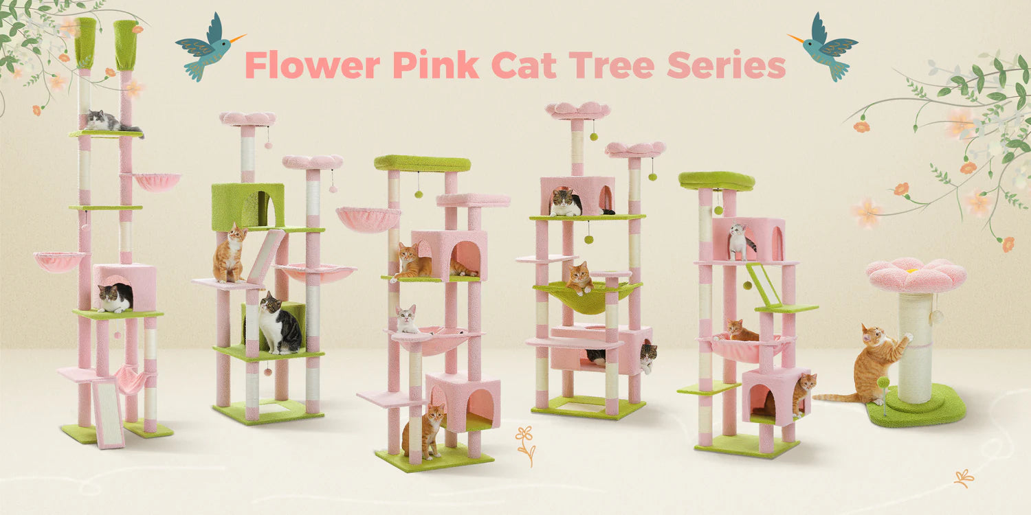 PAWZ Road Flower Cat Tree, Adjustable Floor-to-Ceiling Cat Tower (90.5"-100.4") with Cat Condo, Cozy Hammock, and Scratching Post, Tall Activity Tree for Indoor Cats, Pink