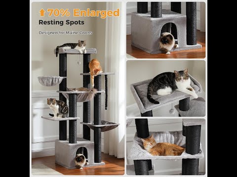 Introducing our new Large Cat Tree, perfect for big cats like Maine Coons and multi-cat households. This robust structure supports up to 220 pounds, accommodating 6-8 large cats. It features wide platforms, a spacious condo, and an oversized hammock (21.3" x 17.3"). Engineered for stability, it boasts 4.3-inch thick sisal posts and a reinforced base, ensuring safety during play. With 13 extra-thick scratching posts and multiple cozy resting spots, it satisfies natural instincts while protecting your furniture. Made from engineered wood, plush, and sisal, it's easy to clean and maintain, offering endless fun for your feline family.
